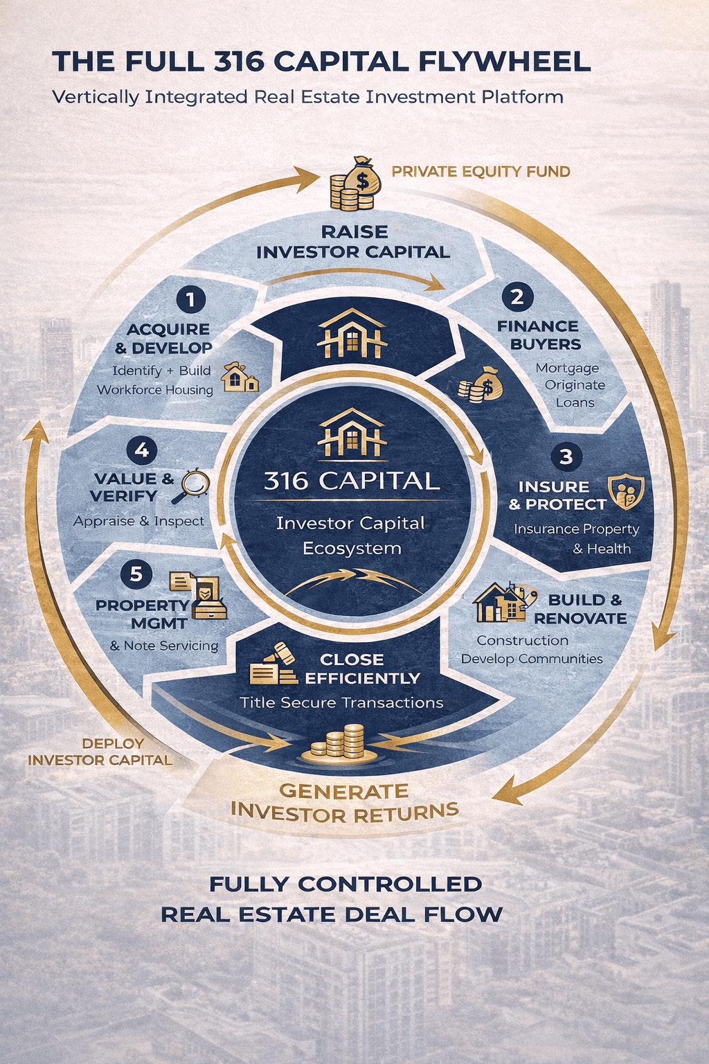316 Capital operates across the full lifecycle of residential real estate and financial services. From financing and construction to insurance, title, and long-term asset management, we control every major component of the value chain—reducing risk, increasing margins, and maximizing impact.
